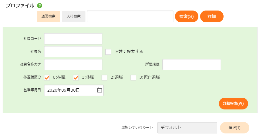 | 休退職区分 | 休退職区分を詳細検索条件にする場合、「チェックあり」にします。 初期表示時、「在職」、「休職」がチェックあり、に設定されています。 | チェックボックス入力 | ||