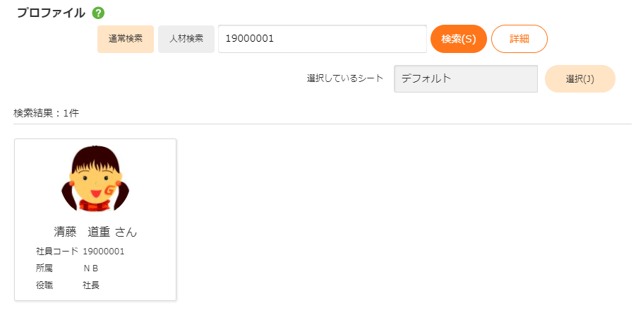 社員の情報を表示します。 クリックすると選択した社員のプロファイル表示を表示します。 |