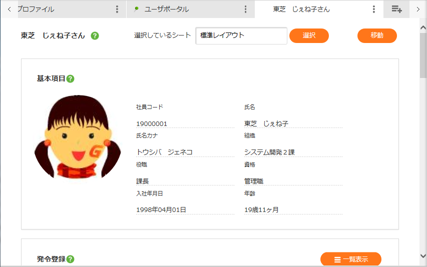 処遇(組織・役職・資格)や生年月日等の基本項目を表示します。 - 人事基本項目登録(プロファイル)