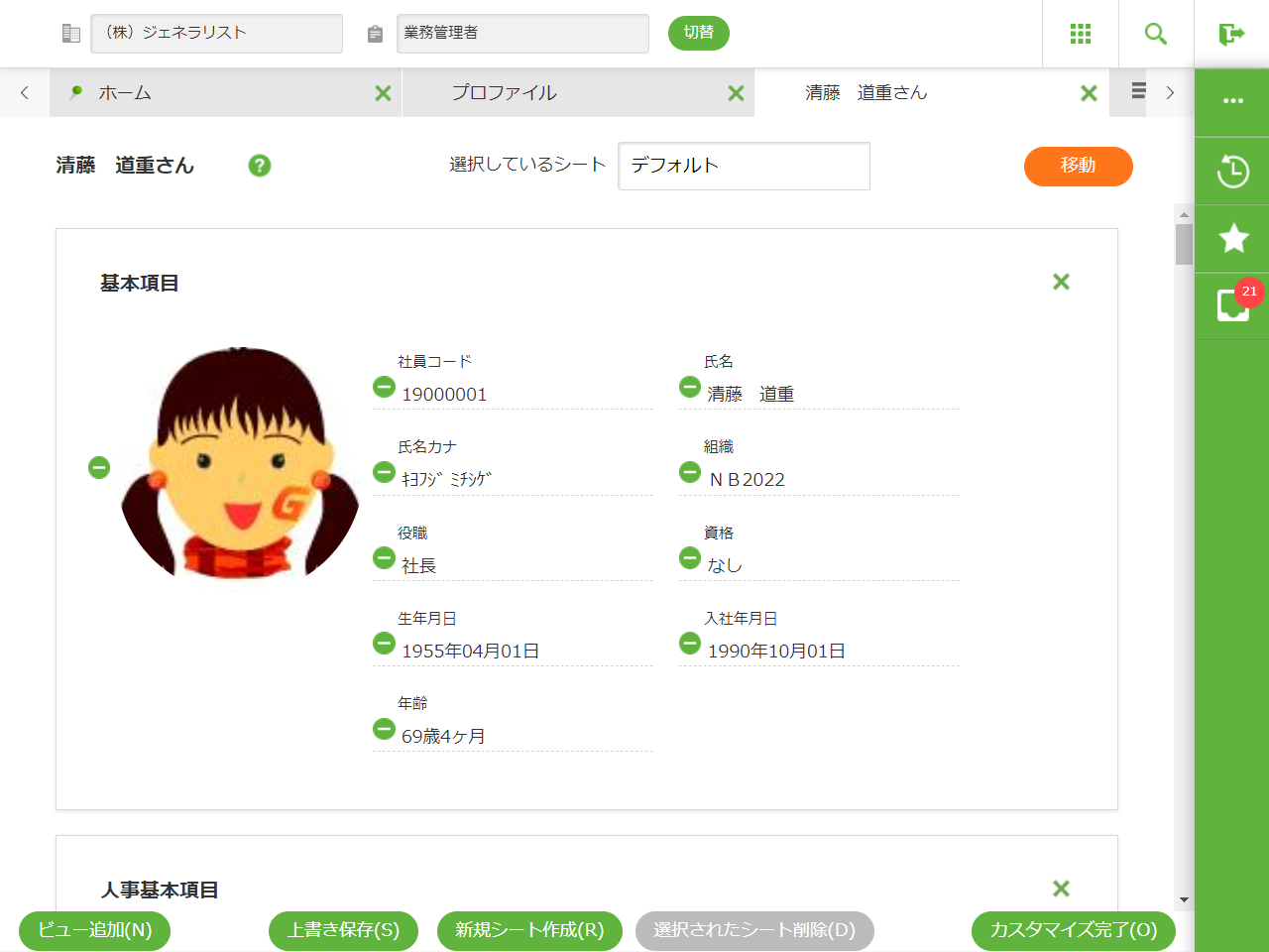 社員のプロファイルを表示します。 | パネル | ||