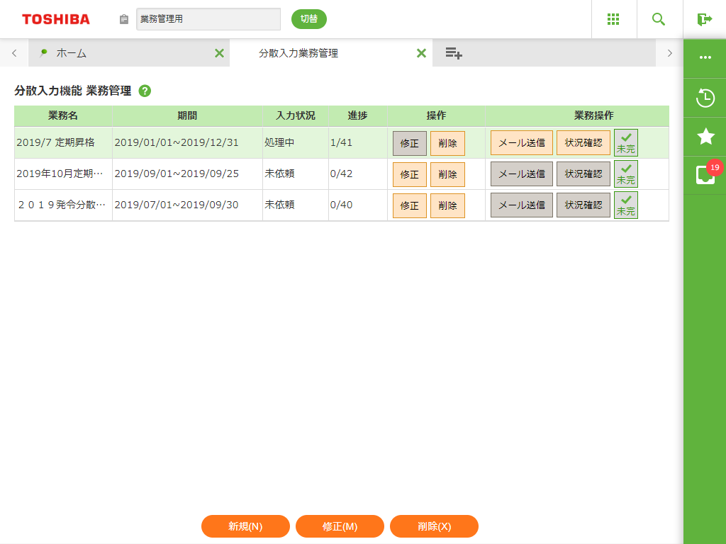| 未完/完了 | 業務入力の完了/未完を設定します。 クリックするとステータスが切り替わります。 |