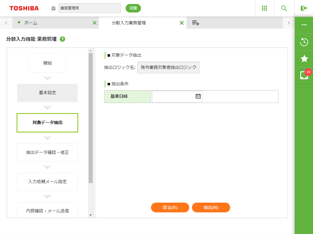 | 基準日 | データ抽出の基準日を入力します。 ※1.7.3 分散入力業務テンプレート設定で基準日を指定している場合は、デフォルトで日付が表示されます。 |