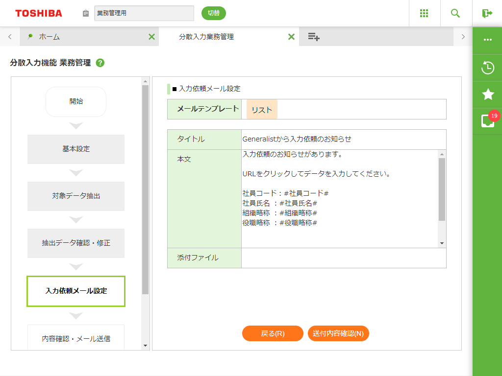予約語 #分散入力業務名# #入力期間# #社員コード# #社員氏名# #組織略称# #役職略称# #URL#