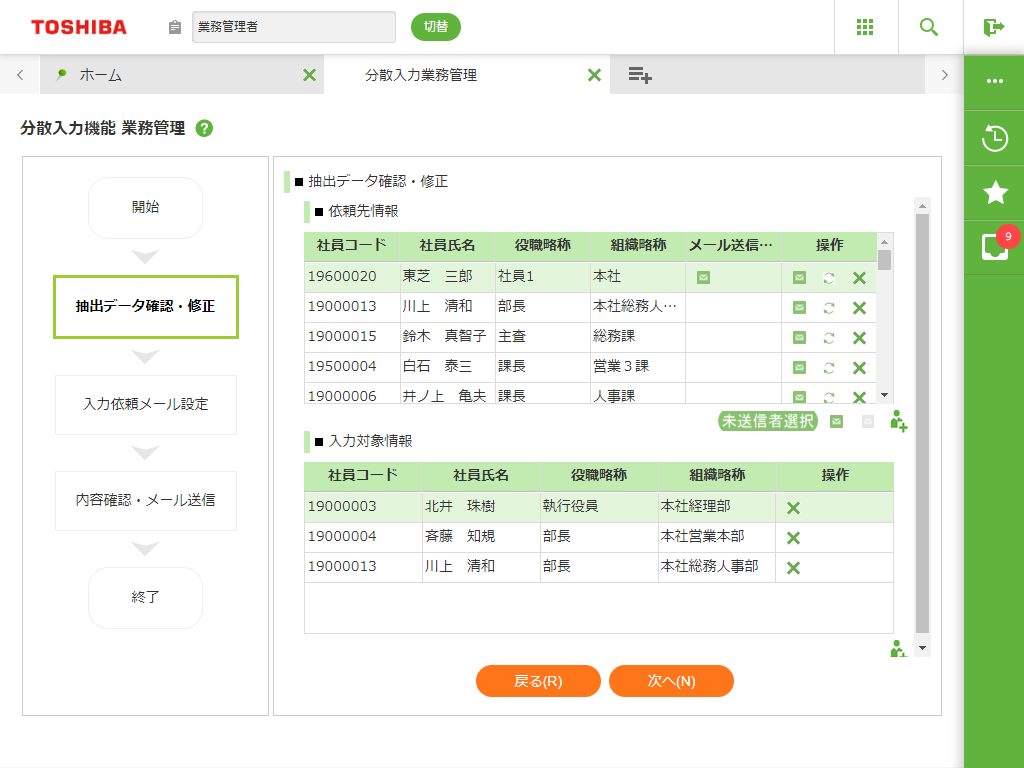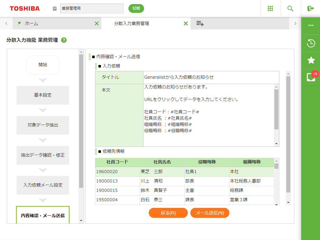分散入力業務テンプレートをもとに、データ収集依頼するための入力対象者/入力依頼対象者の自動抽出や手動での設定および入力依頼メールの送信を行うことができます。