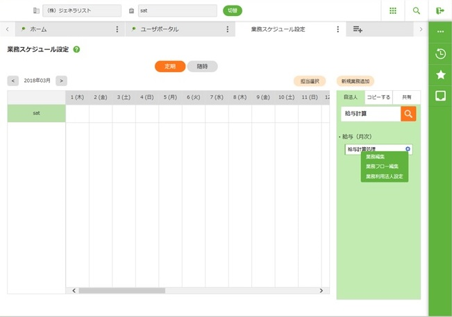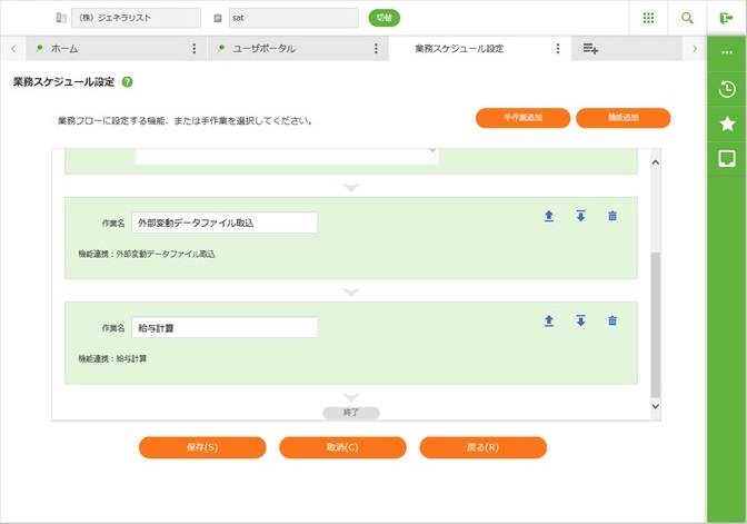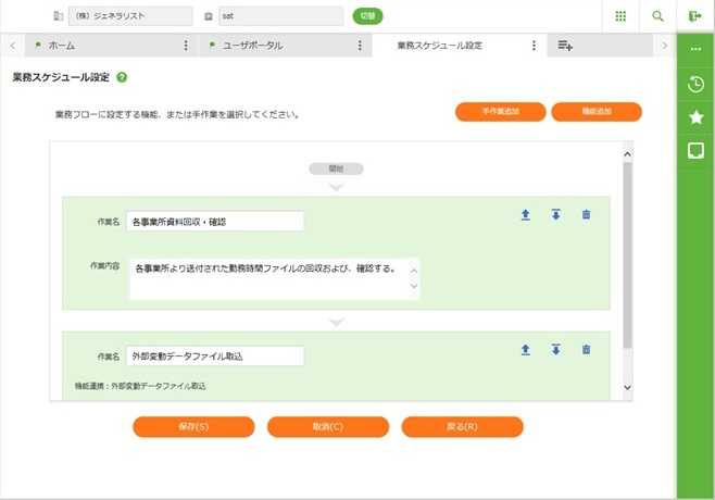 「業務・機能」に「業務スケジュール設定」を選んで[今すぐ実行]ボタンをクリックします。 - 修正する業務の「歯車」マークをクリックし、「業務フロー編集」をクリックします。
