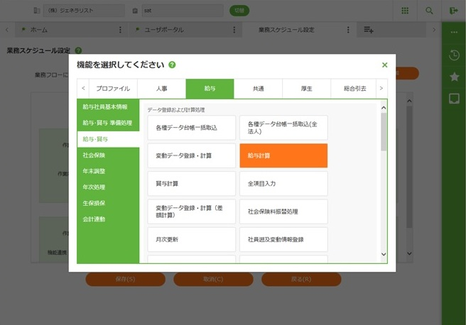 今回は給与計算機能を追加するため[機能追加]ボタンをクリックします。 - 給与計算を選択します。選択したら×ボタンをクリックして閉じます。