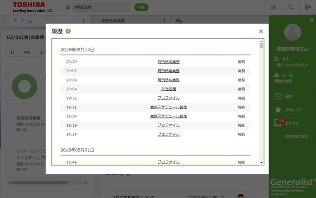 ユーザメニューエリアの[履歴]ボタンをクリックします。